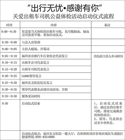 1、7月18日-10月18日活动期间,所有出租车司机,凭有效证件(驾驶证、身份证、出租车司机上岗证),可享受由福州东方男子医院提供的免费体检1份,到院体检的还可领取大礼包1份;